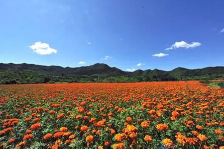 四季花海位于京郊延庆县。这里海拔高、林木覆盖率高、日照充足,是一个天然大花圃,今年在已有花卉数千余亩的基础上,又新增种植了大片花卉,现在正是数千亩的万寿菊在山野间竞相开放的时节,天地四野好像都被染尽了一片金黄,此情此景构成了一幅极具冲击力的震撼画面。山顶设有观景台,俨然已经成了摄影天堂。